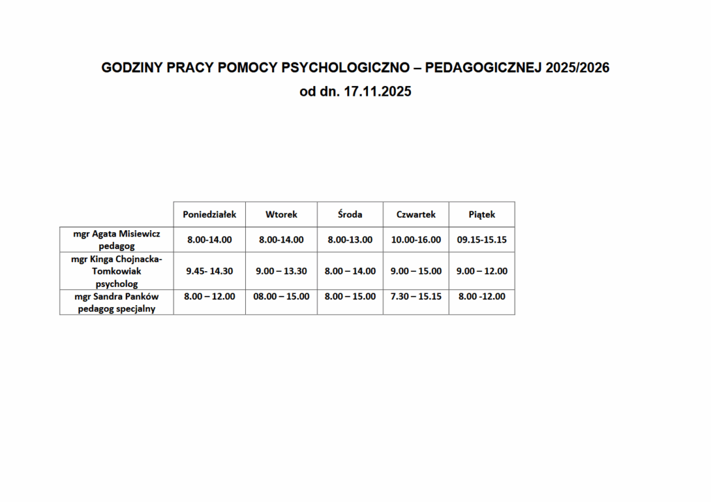 GODZINY PRACY POMOCY PSYCHOLOGICZNO – PEDAGOGICZNEJ 2025/2026
