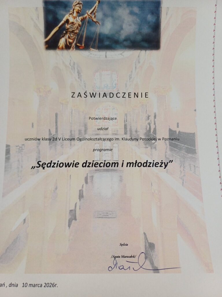 W dniu 10 marca 2026r klasa 2d uczestniczyła w wyjściu klasowym do Sądu Rejonowego Poznań Stare Miasto. Uczniowie poznali pracę sądu oraz przeprowadzili symulację rozprawy sądowej.